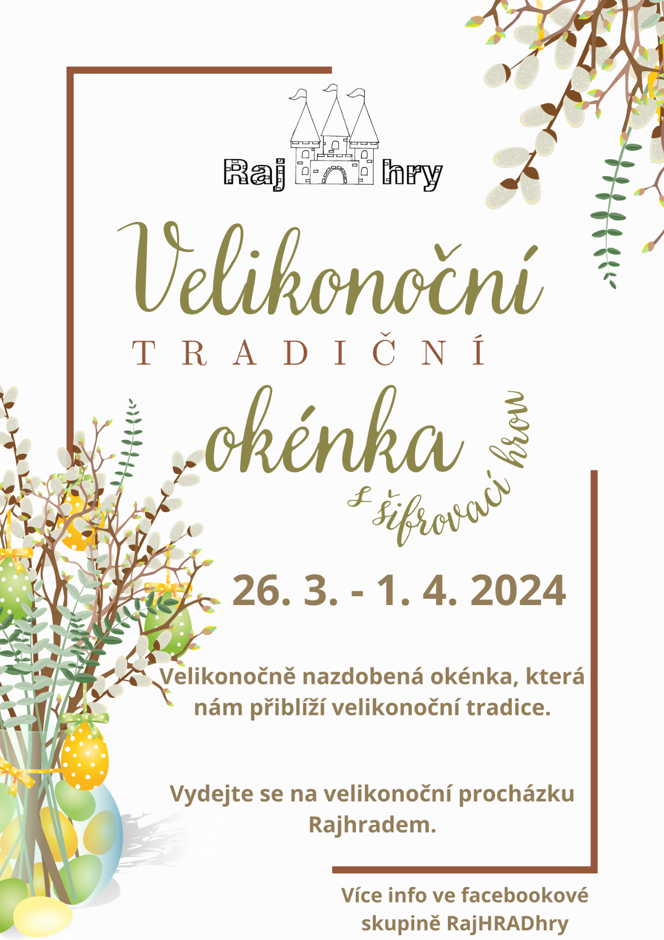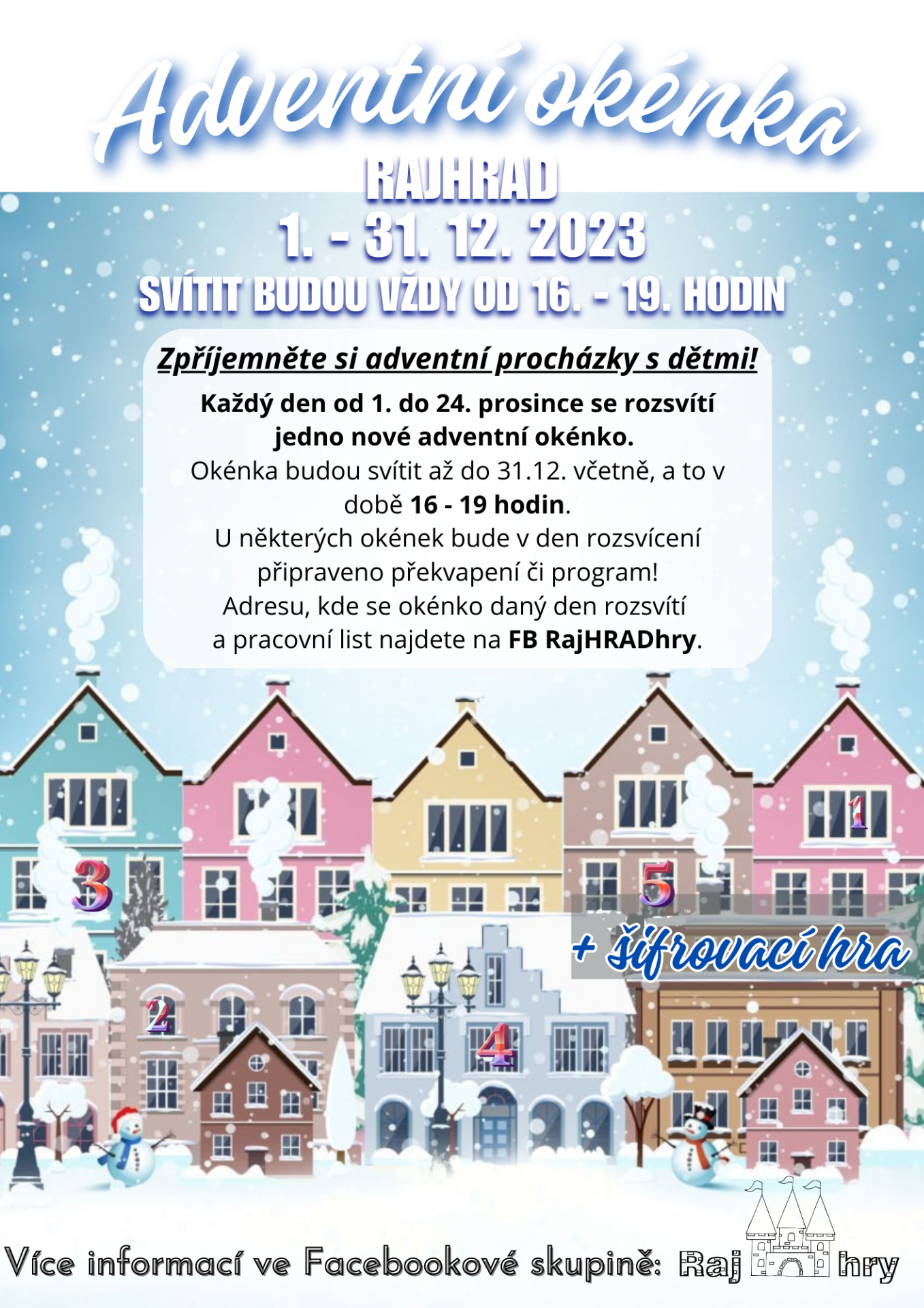 Druhý ročník Velikonočních okének, která nám tentokráte přiblíží či oživí tradice Velikonoc. Součástí Velikonočních okének bude zase i šifrovací hra s herním plánem. Některá okénka si pro vás připravila i drobné pohoštění. Program bude včas zveřejněn.